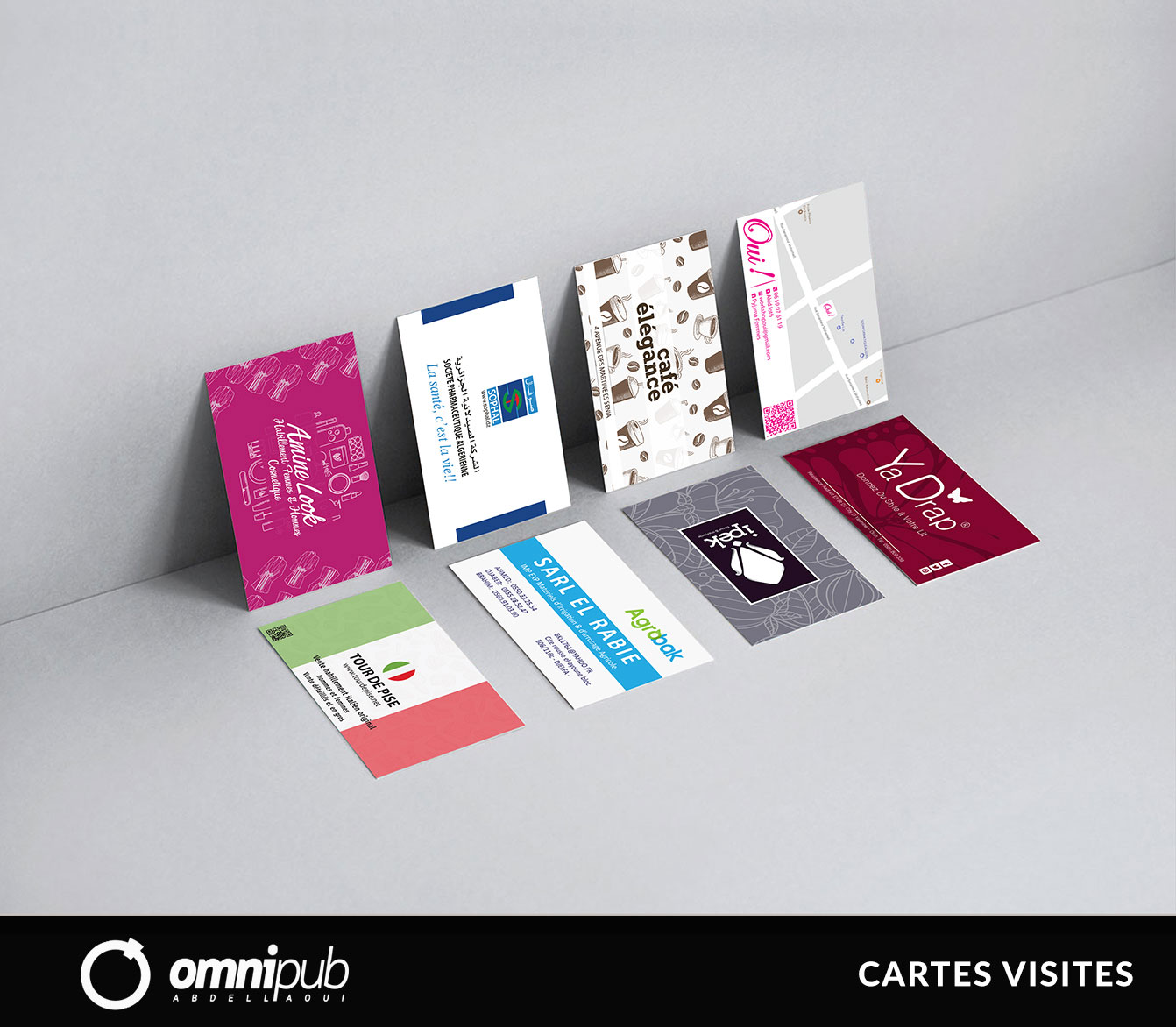 OmniPub Abdellaoui vous permet de diffuser votre communication par différents supports papier (Cartes de visite, Flyers, Pochettes à rabats, etc…).